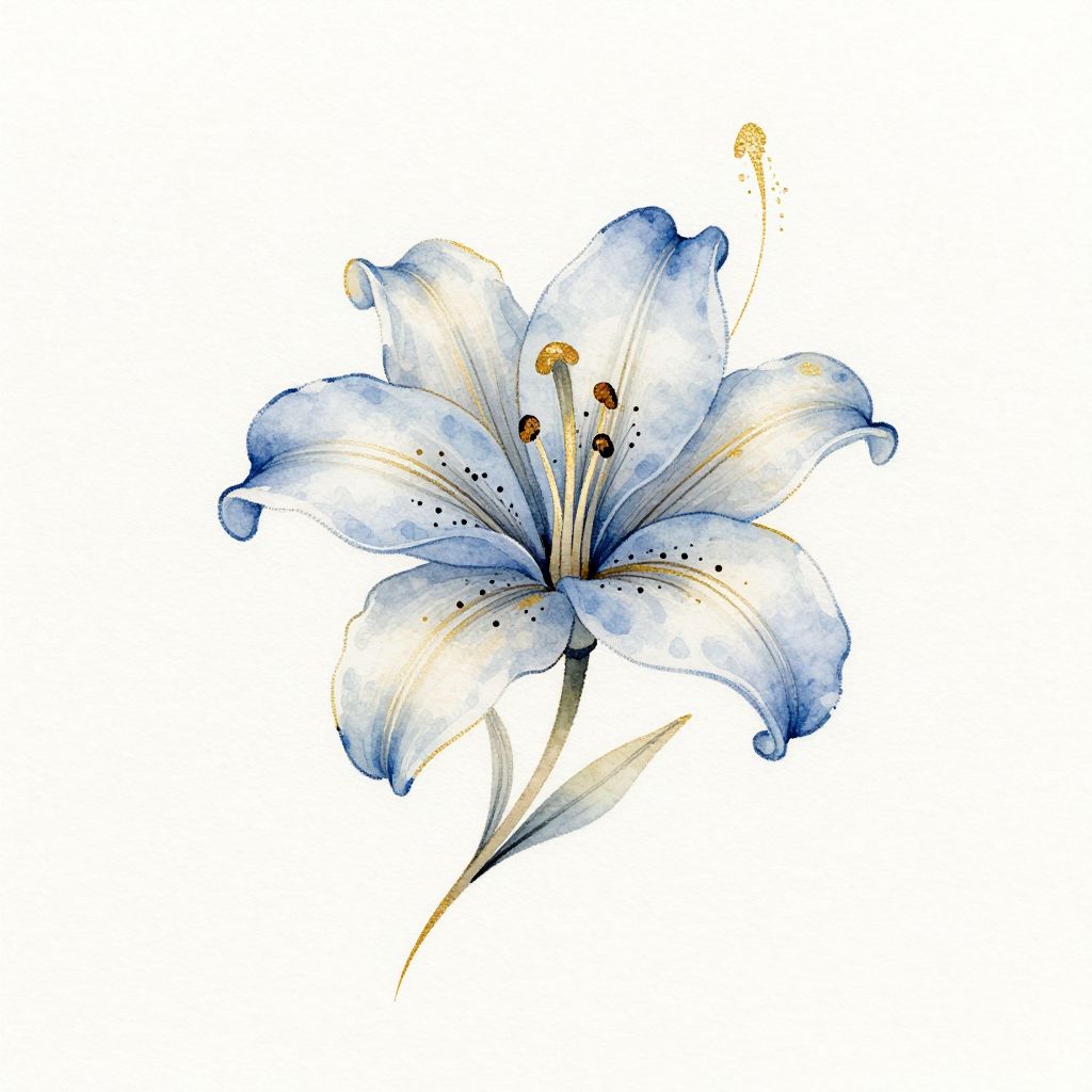 Cute elegant watercolor lily flower tattoo design, delicate colors, blue, light blue, golden, black ink details, white background,