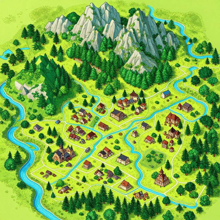 Isometric fantasy map featuring lush forests, towering mountains, winding rivers, and scattered medieval villages, rendered in vibrant colors with intricate details and a hand-drawn style, evoking a magical and adventurous world.