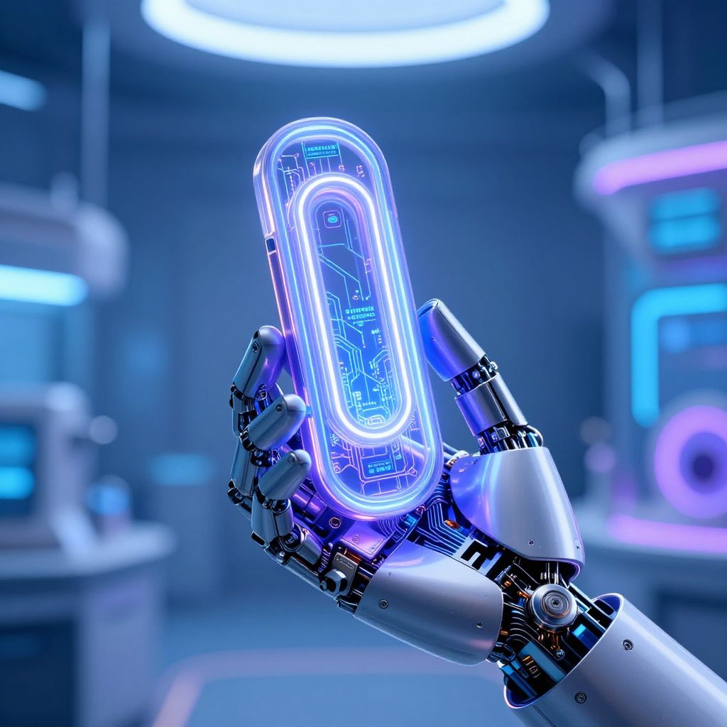 A high-tech CGI image depicts a metallic, robotic hand with detailed mechanical joints holding an illuminated, rectangular, blue and white circuit board. The hand's fingers are articulated with visible gears and wires. The background is a futuristic laboratory with blurred, glowing blue and purple lights, creating a sleek, sci-fi atmosphere. The circuit board emits a bright, neon-blue light, highlighting its intricate electronic pathways. The image emphasizes advanced technology and robotics in a modern, high-tech setting.