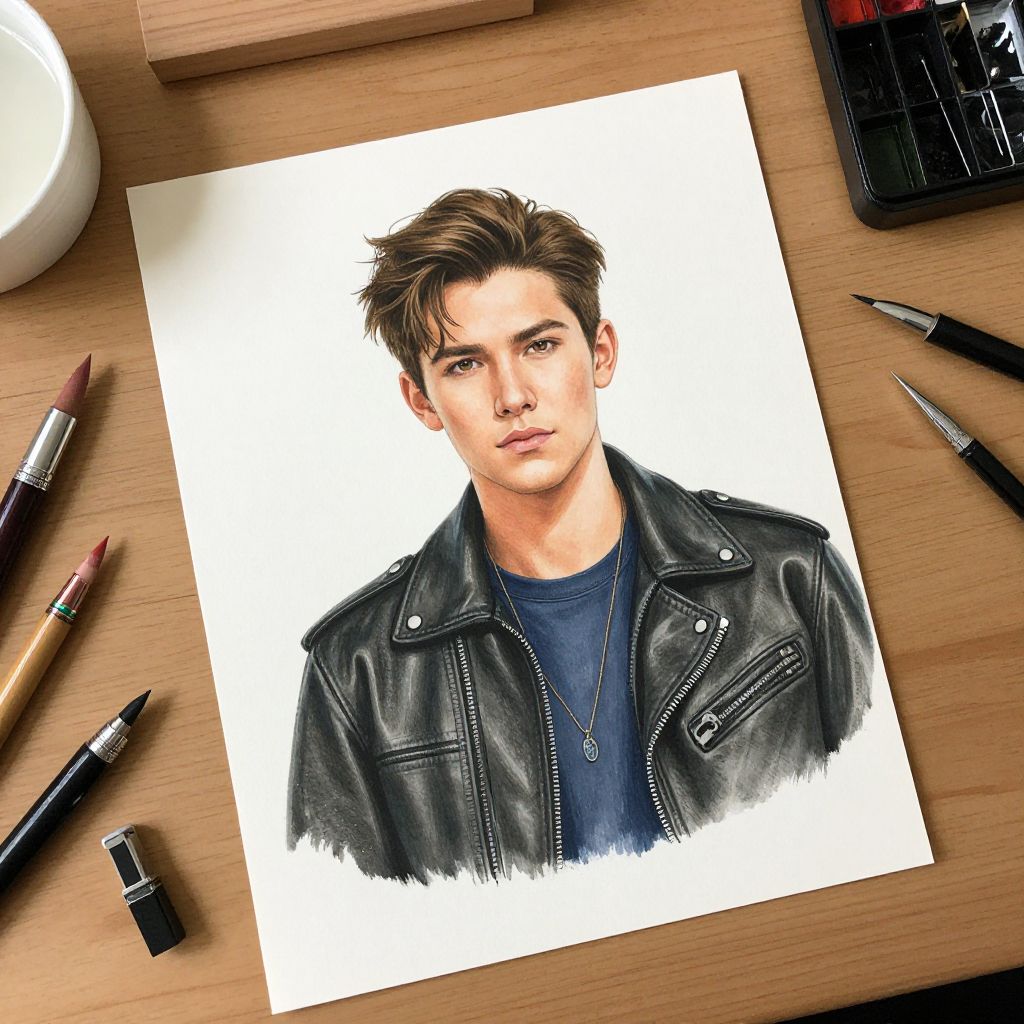 A detailed drawing of a young man in a leather jacket, surrounded by art supplies and tools on a wooden desk.