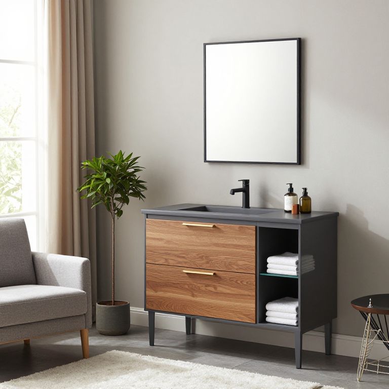 Modern bathroom photograph: wooden vanity with black sink, gold handles, white towels, black frame mirror, potted plant, gray armchair, beige curtains