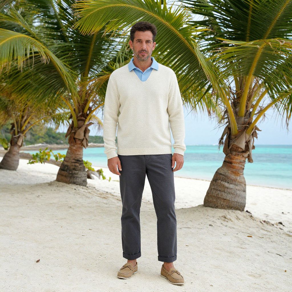 A man, light blue polo shirt, dark gray khakis, tan boat shoes, cream cotton sweater, standing on a white sandy beach, Cibachrome style, relaxed expression, surrounded by lush green palm trees, crystal-clear turquoise waters in the background. Man has masculine face and piercing eyes