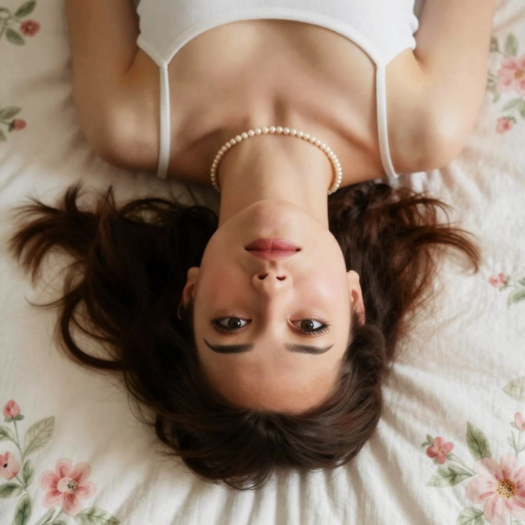 Photograph of a woman lying on a floral quilt, viewed from above. Her head is upside down, brown hair spread out, brown eyes looking up, neutral facial expression, light skin, subtle makeup, pearl necklace, floral quilt with pink and green patterns.