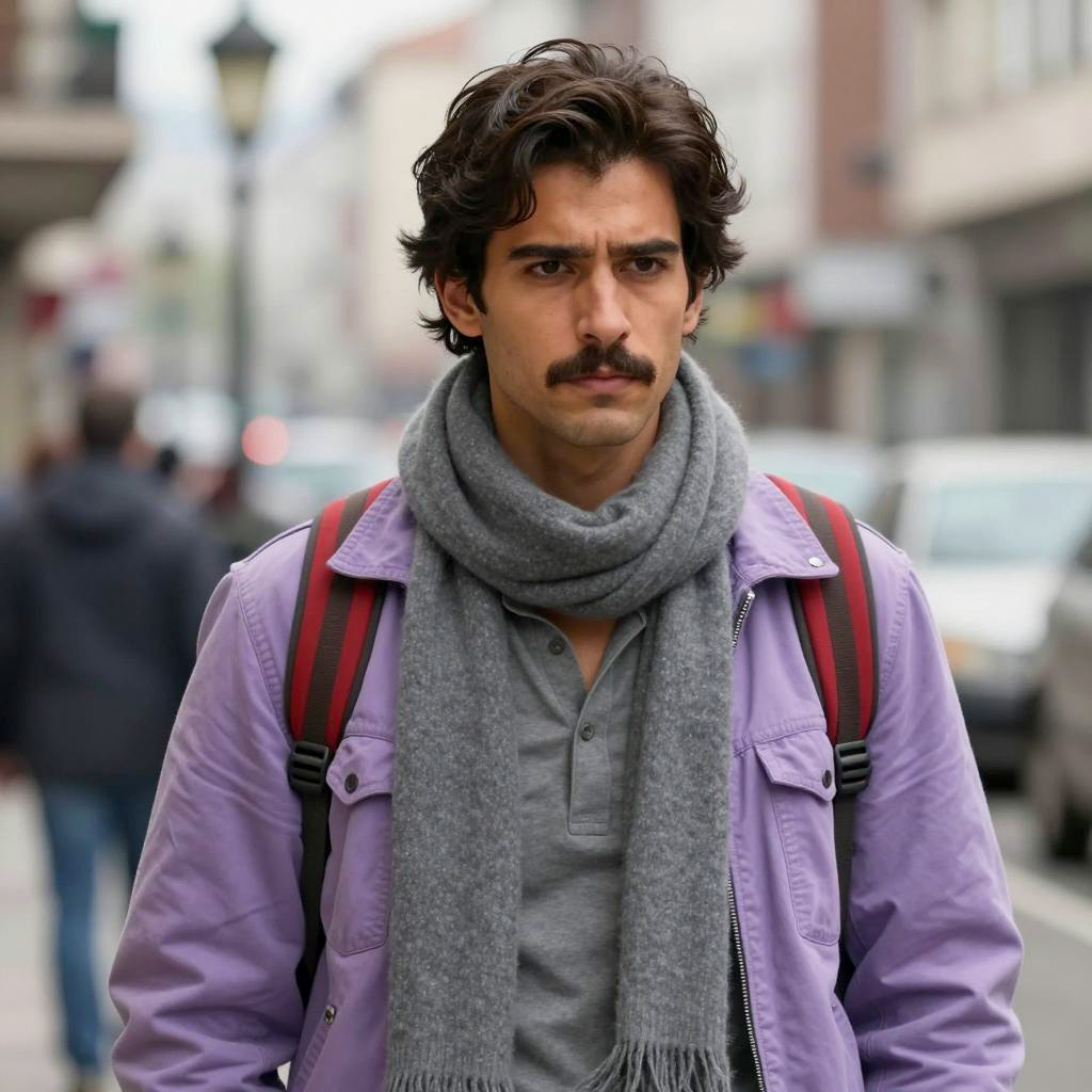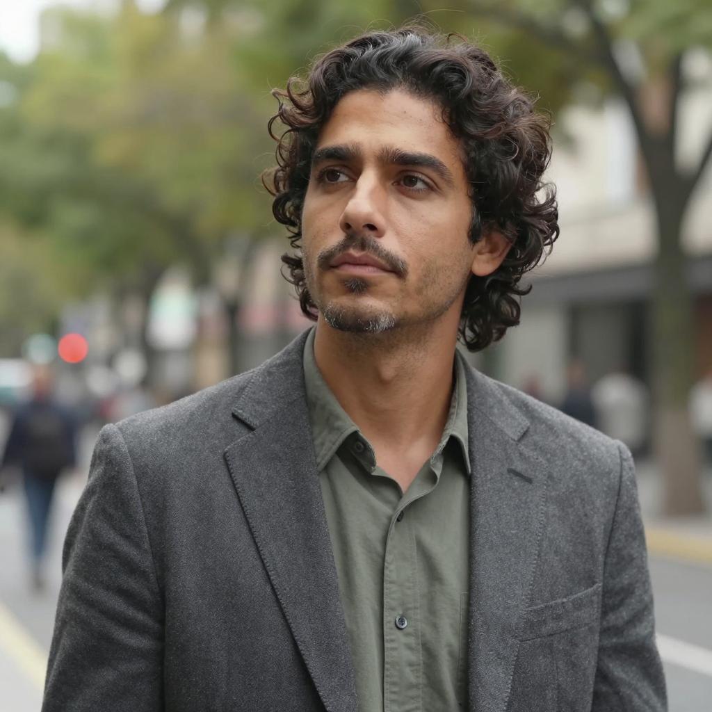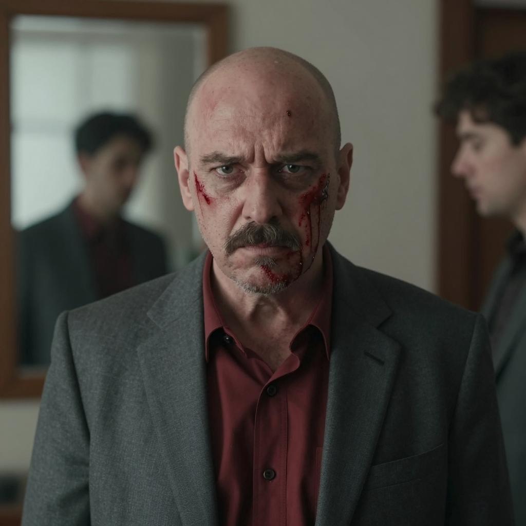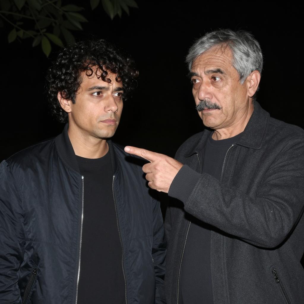 Middle-aged man with dark mustache and curly hair, wearing a blue shirt and black leather jacket, looks intently through a red-framed window. Breath visible on glass. Blurred background. Man positioned centrally, upper body visible.
