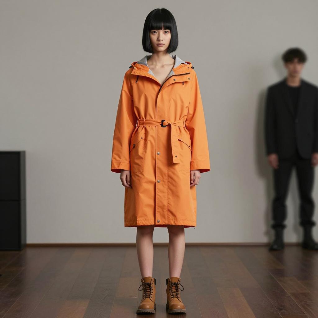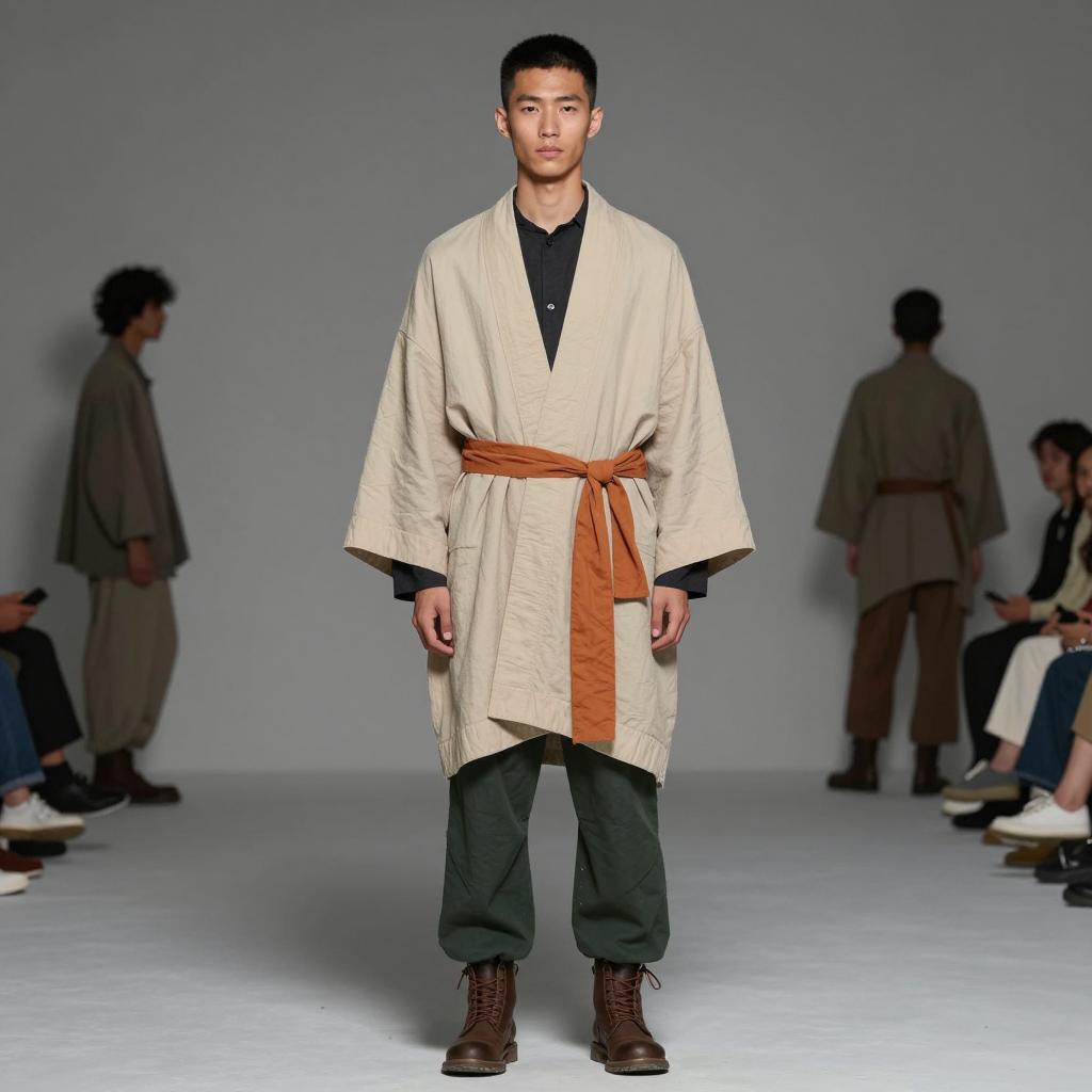 Material cloth style costume, photograph of young Asian man, standing center, fashion model, wearing oversized beige shawl, orange waist tie, dark green pants, brown boots, black shirt, gray background, blurred people in background, minimalist style, runway fashion show, casual yet elegant, neutral colors, ured fabrics, modern yet traditional, realistic detail, full body shot