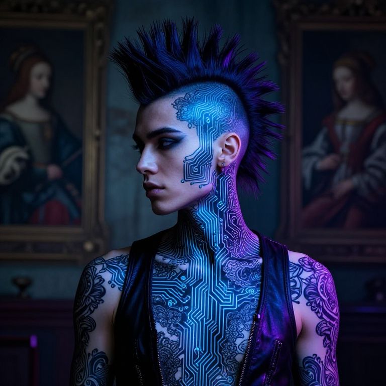 Cyberpunk renaissance punk fashion portrait, young rebel with mohawk hairstyle, intricate circuitry tattoos blending with baroque lace patterns, glowing blue and purple hues, dystopian urban background with vintage renaissance art elements