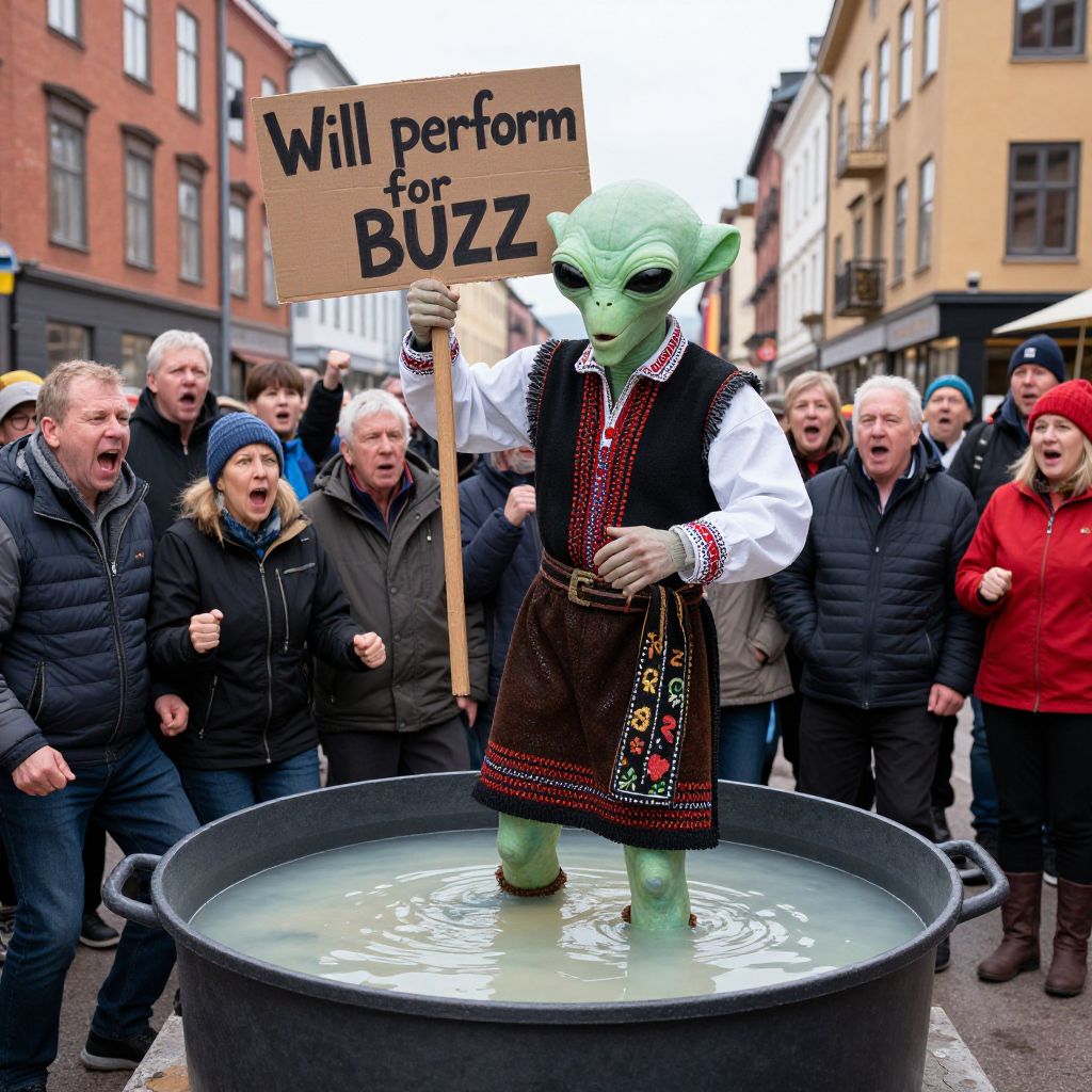 A street performance on Damstredet in Oslo, Norway, Mac the alien in a Bunad, performing the traditional norwegian ritual of bathing in lapskaus, a highly controversial practice that involves dressing up in a Norwegian traditional dress, A riled up crowd of old norwegian fishermen cheering aggressively, A cardboard sign says ”Will perform for BUZZ”