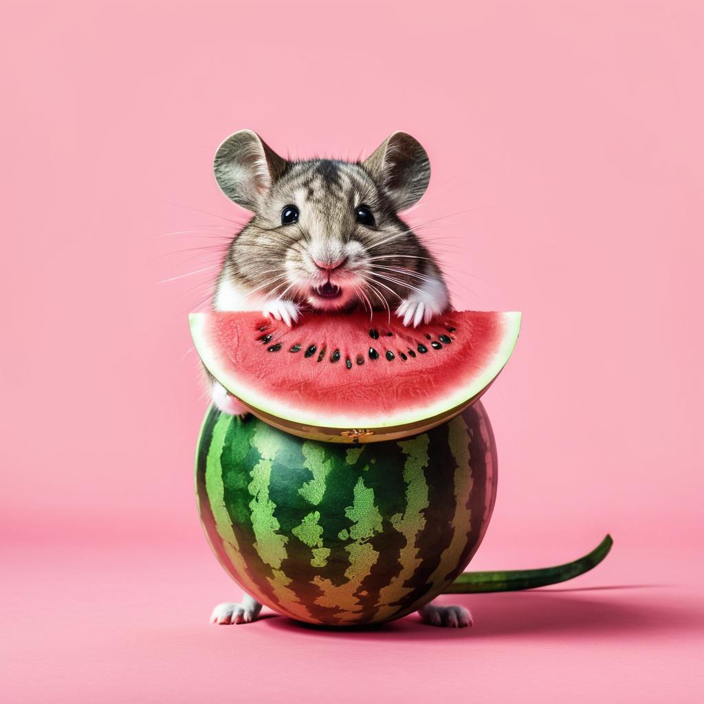 A close-up of a small, adorable mouse holding a slice of watermelon while sitting inside a hollowed-out watermelon rind, set against a pink background. The mouse's fur is gray and white with large ears and bright eyes, creating a charming and playful composition.