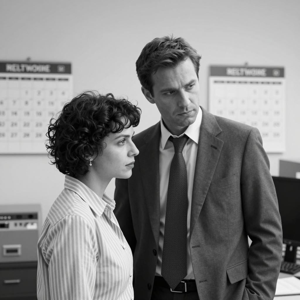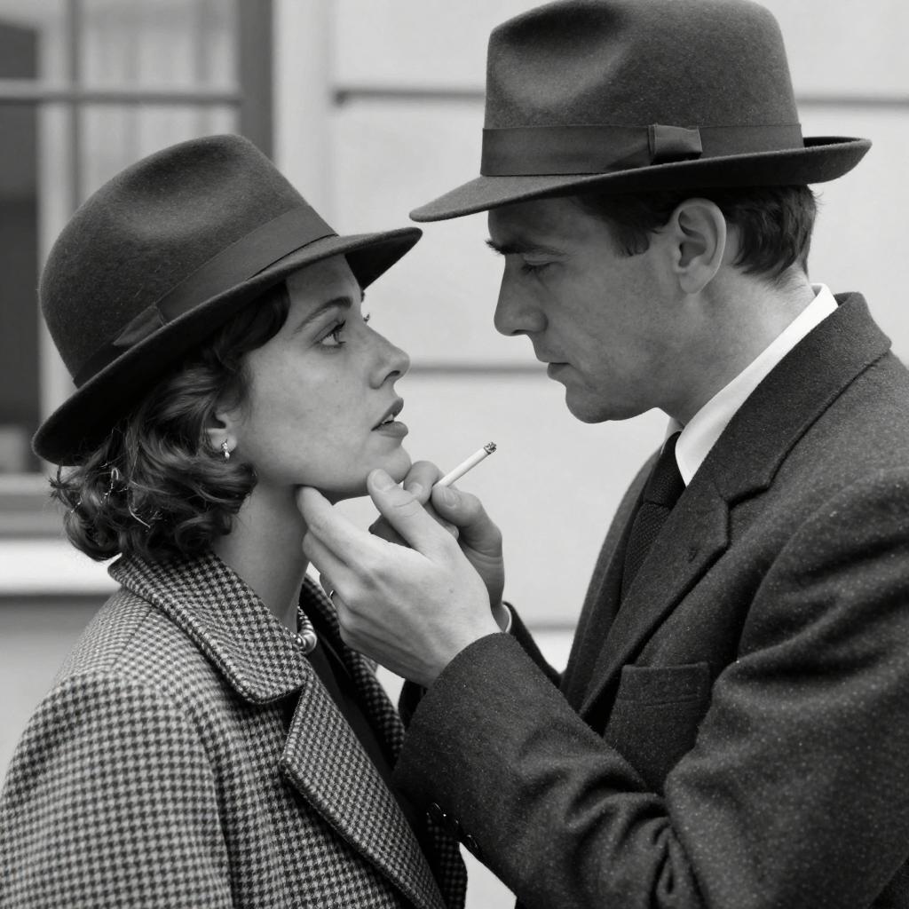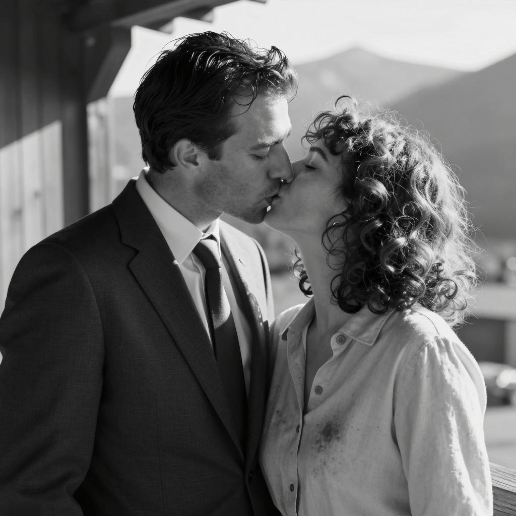 Black and white photograph of a man and woman in an intimate close-up. Man with short, dark hair, wearing a suit and tie, leans in to kiss woman. Woman with curly hair, wearing a striped blouse and earrings, looks up at man, holding a gun in her right hand. Their faces are close, eyes closed. Man's left hand rests on her shoulder. Background is blurred.