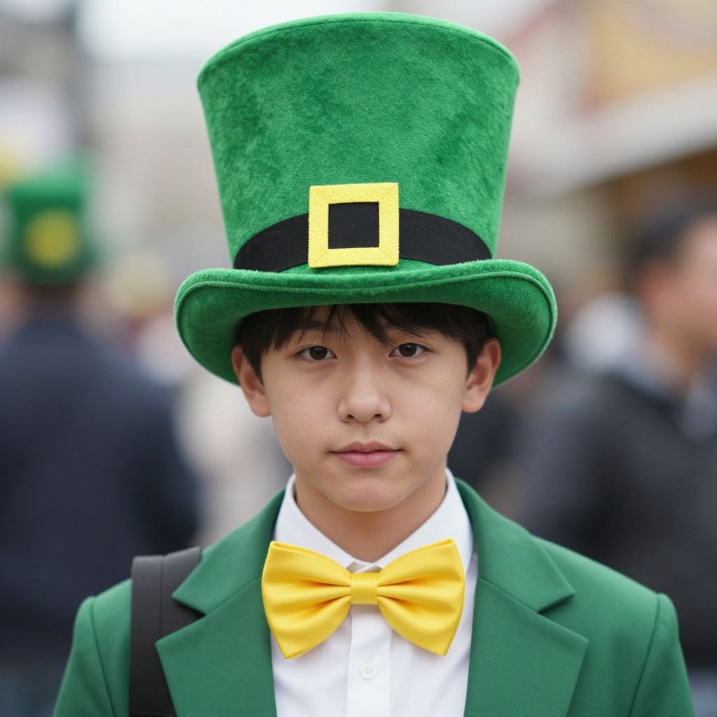 Photograph of a young Asian boy with straight black hair, wearing a large, vibrant green top hat with a black band and yellow square buckle. He also has on a green jacket, white shirt, and bright yellow bow tie. The background is blurred, showing indistinct figures and buildings, suggesting an outdoor event or parade. The boy's expression is neutral, and his skin is light. The overall style is whimsical and festive, reminiscent of St. Patrick's Day or a similar celebration.