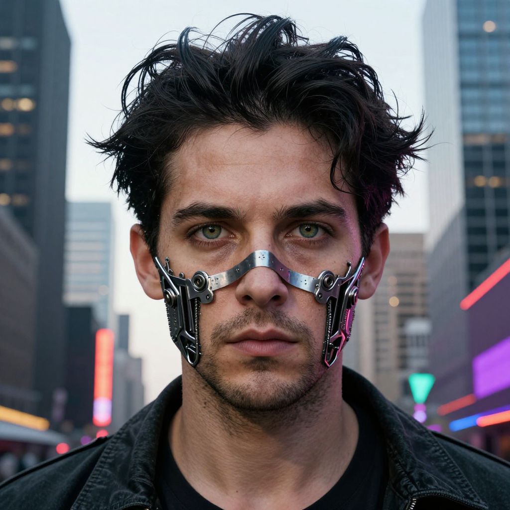 Photograph of a young man with tousled black hair and light green eyes, standing in a cityscape with tall buildings and neon lights in the background. He has a metallic, cybernetic mask covering the lower half of his face, featuring intricate, mechanical designs. He wears a black jacket over a dark shirt, and the image has a slightly dramatic, sci-fi feel. The lighting is bright, highlighting his intense gaze and the contrast between his natural features and the futuristic mask. The background is slightly blurred, emphasizing the subject.
