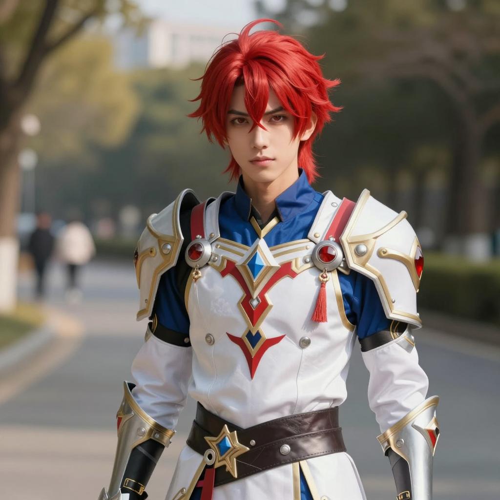 Hisoka cosplay costume, photorealistic, young androgynous character, pink and blue hair, elaborate updo, fantasy style, pale skin, sharp facial features, white and green jacket, decorative buttons, pink and blue circular brooches, standing outdoors, modern architectural background, soft lighting, shallow depth of field, digital art, detailed ures, sci-fi fantasy vibe