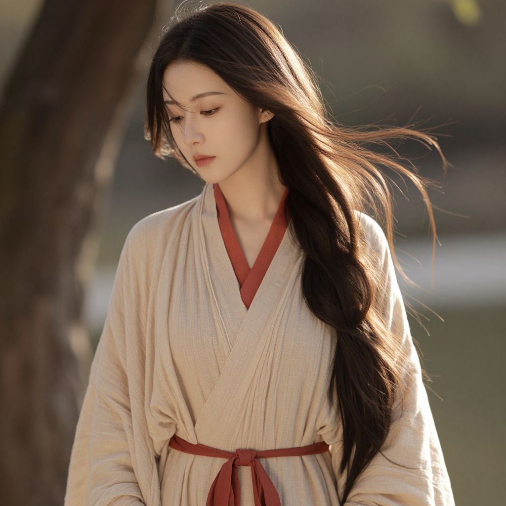 A serene woman with long, flowing brown hair that cascades down her back, gently falling over her shoulders. She wears a soft, flowing beige robe that drapes elegantly around her, with a delicate red sash tied securely around her neck, adding a touch of warmth and elegance. Her expression is calm and peaceful, with a subtle glow in the light, suggesting a sense of wisdom and quiet strength. She stands in a softly lit, natural outdoor setting—perhaps beside a tree or in a quiet garden—enhancing the tranquil and mystical atmosphere.