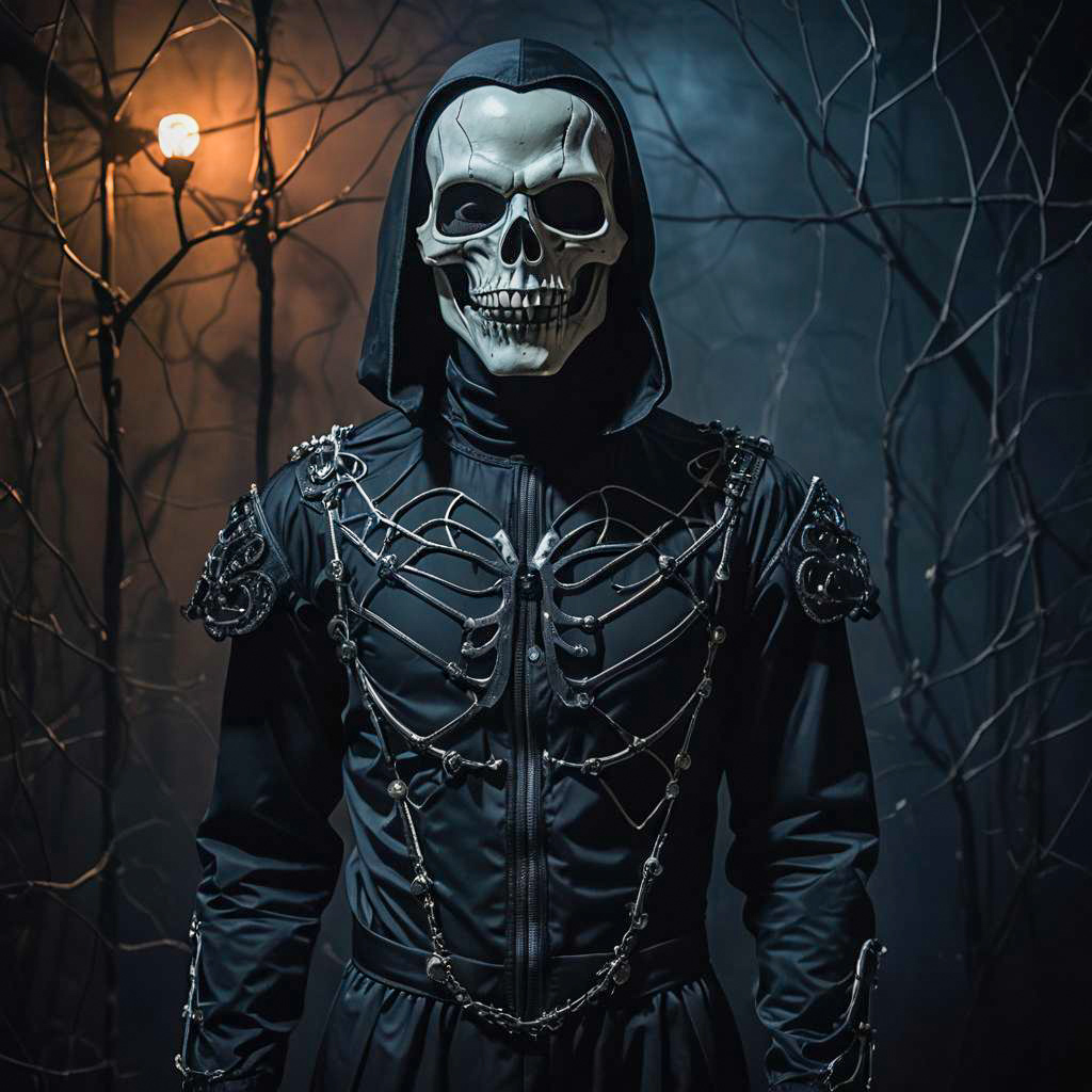 Halloween outfit, worn by mysterious vampire, featuring skeleton jumpsuit with LED mask, in dark and eerie tones, captured in playful Halloween party shot.