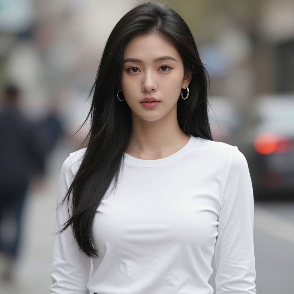 Photograph of an East Asian woman with long, straight black hair standing in a blurred, indoor, urban setting. She has fair skin and wears a fitted, black, sleeveless dress with a sweetheart neckline and ruffled skirt. Her expression is neutral, and she has small, silver hoop earrings. The background is out of focus, showing indistinct figures and bright light, suggesting a busy public space. The image emphasizes her elegant, stylish appearance and the contrast between her dark dress and light skin.