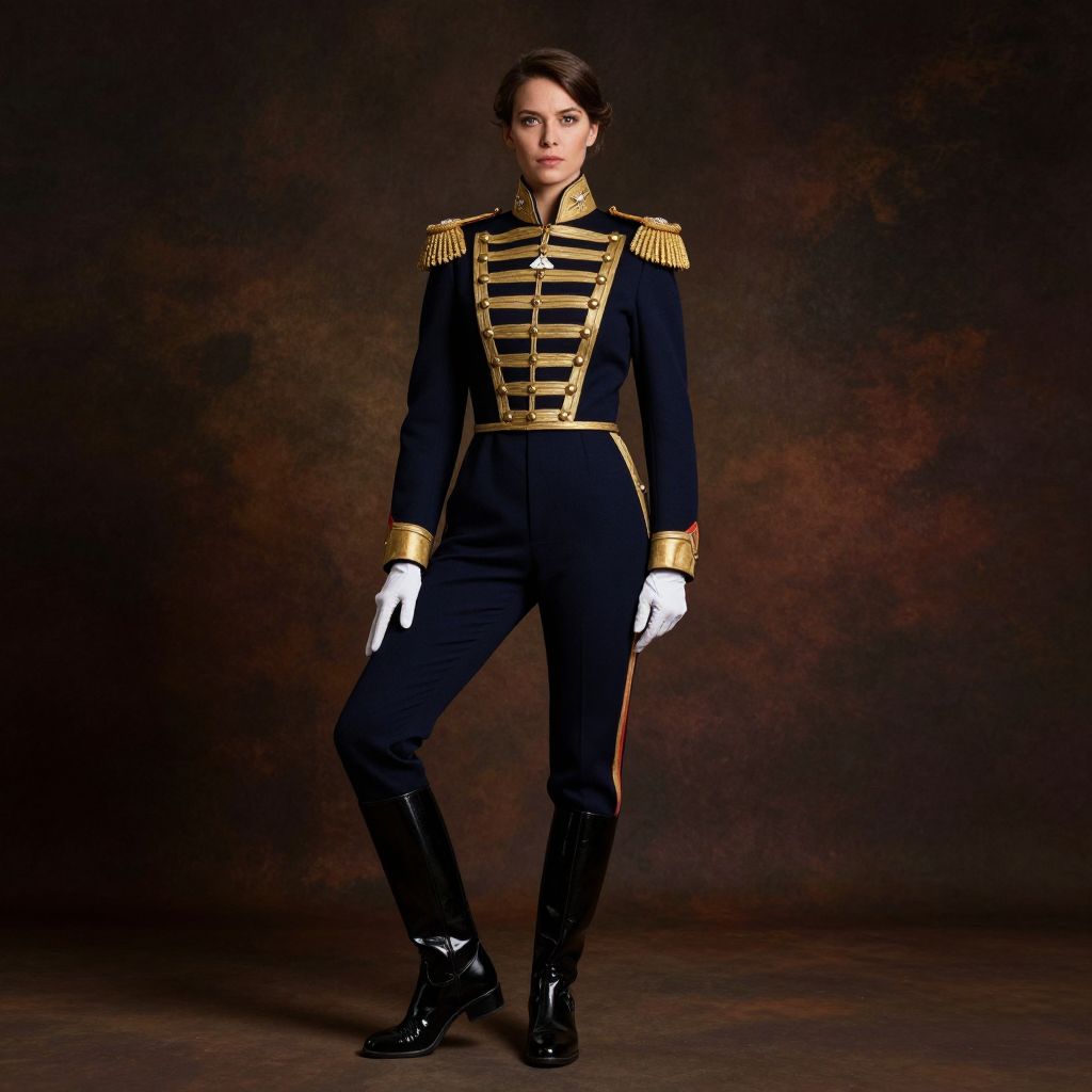 In this captivating image, a woman exudes regal elegance and strength, donning a meticulously detailed hussars uniform that speaks volumes of her noble status. The uniform, a striking combination of dark blue and gold, features elaborate shoulder epaulettes and ornate buttons, accentuating her commanding presence. Her riding boots, polished and sturdy, rest confidently on the ground, while her gloves add a touch of formality to her attire. The woman's dramatic pose, with one leg crossed over the other, enhances the sense of power and authority. The background, a rich, textured canvas of dark hues, contrasts beautifully with the vibrant colors of her uniform, drawing the viewer's eye directly to her. The overall composition is balanced, with the woman centrally positioned, her gaze fixed forward, embodying a sense of purpose and determination.