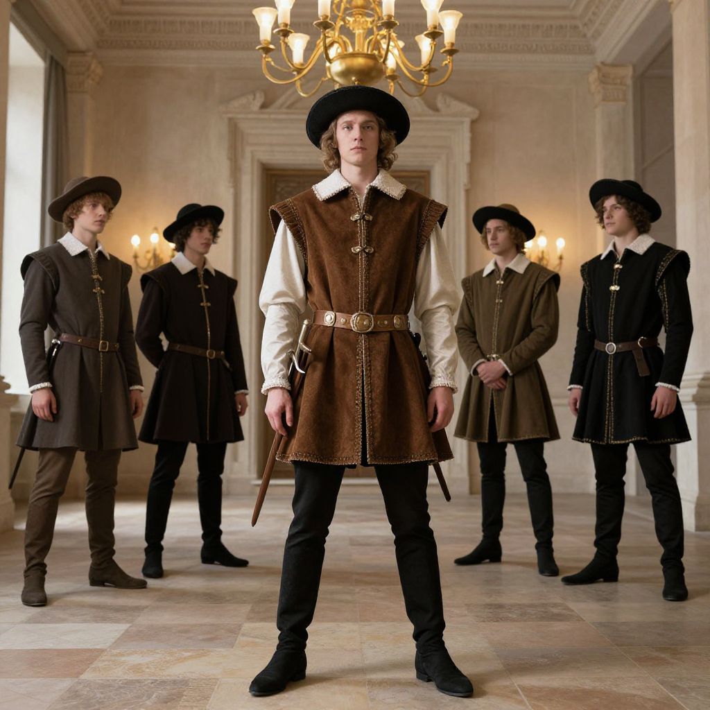 Renaissance musician costume, hat, chandelier, boots, weapon, male focus, multiple boys, 1boy, indoors, belt, standing