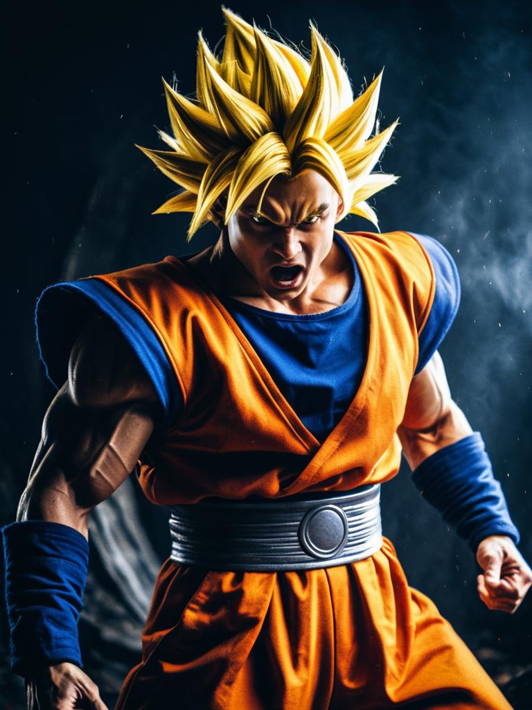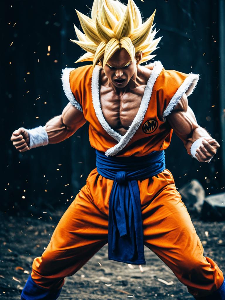 Man in Super Saiyan Costume, cinematic realism, dramatic action cosplay photo