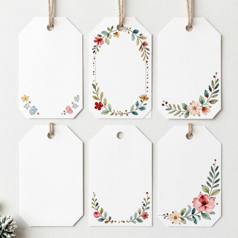 Aesthetic Christmas blank labels featuring watercolor floral designs, embroidered accents, and iridescent sparklecore elements.