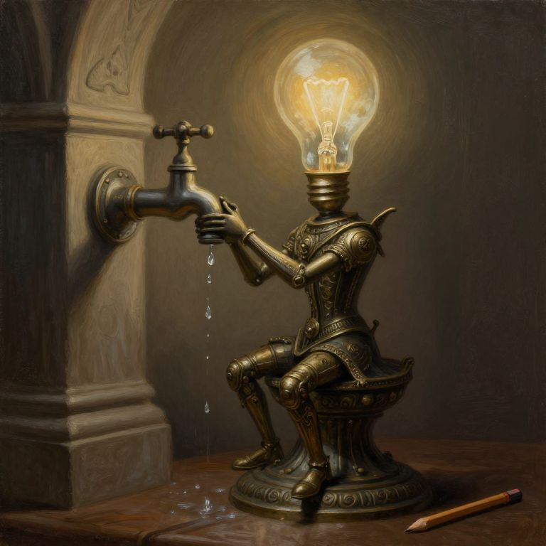 This is a digitally created, surreal artwork depicting a bronze sculpture of a small, humanoid figure with a large, glowing light bulb for a head. The figure is kneeling beside a bronze faucet, which it is turning, causing water to drip. The light bulb emits a warm, yellow glow, illuminating the dark, textured background. The figure wears intricately detailed armor and is positioned on a round base. To the right of the sculpture, a wooden pencil lies on the dark, wooden floor. The background features a stone arch, adding a classical touch to the fantastical scene.
