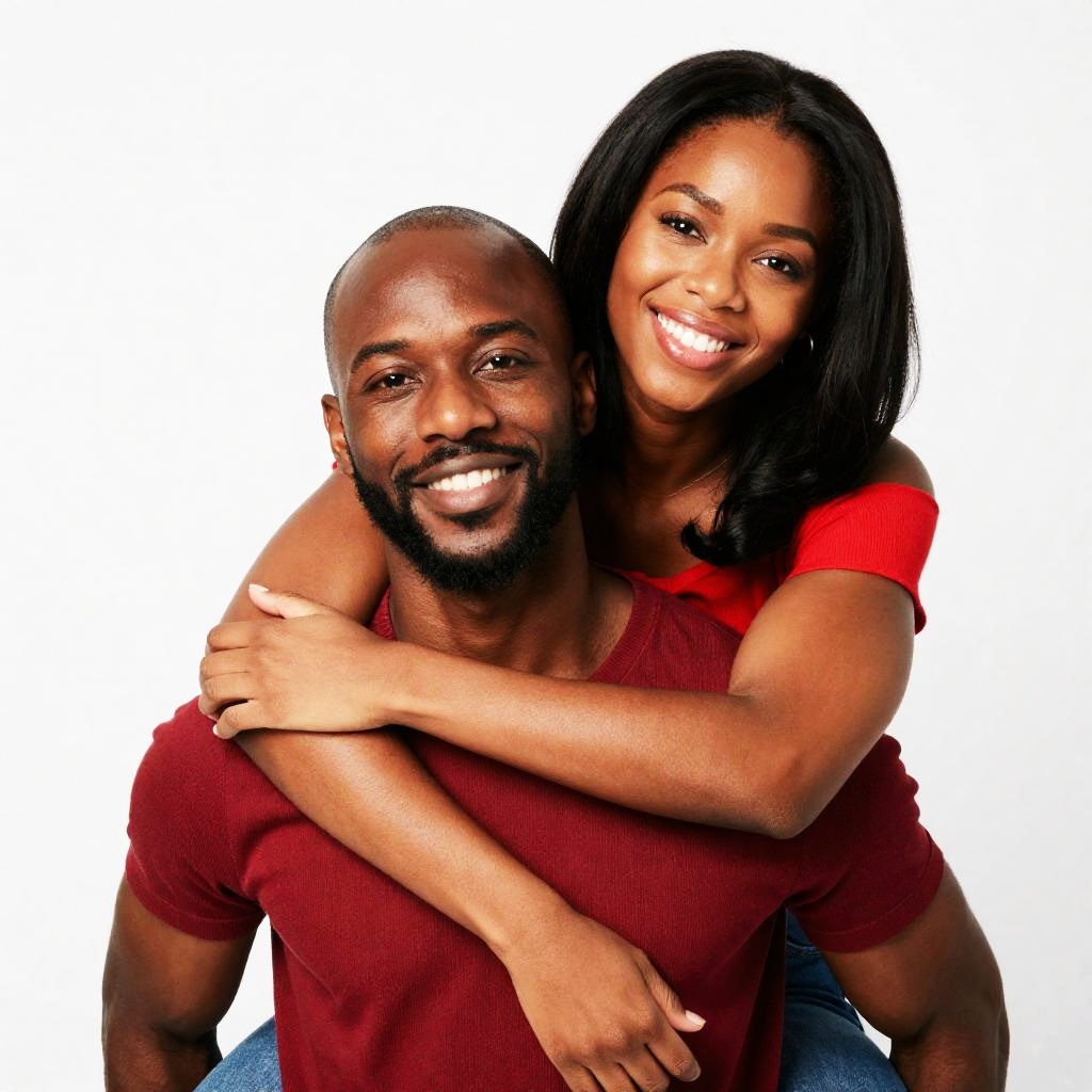 Photograph of a Black couple. Man with shaved head and beard, wearing a red ribbed shirt, smiling. Woman with long black hair, wearing a red off-shoulder top and blue jeans, hugging him from behind, smiling. White background.