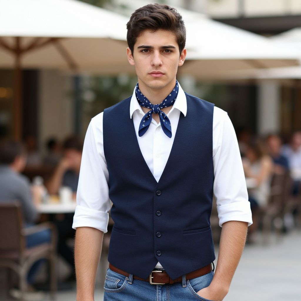 Photograph of a young man standing confidently outdoors. He has short, dark brown hair, light skin, and a serious expression. He's wearing a white shirt with rolled-up sleeves, a navy blue vest, a blue patterned neckerchief, and blue jeans with a brown belt. The background is slightly blurred, showing an outdoor café with people sitting at tables and umbrellas.