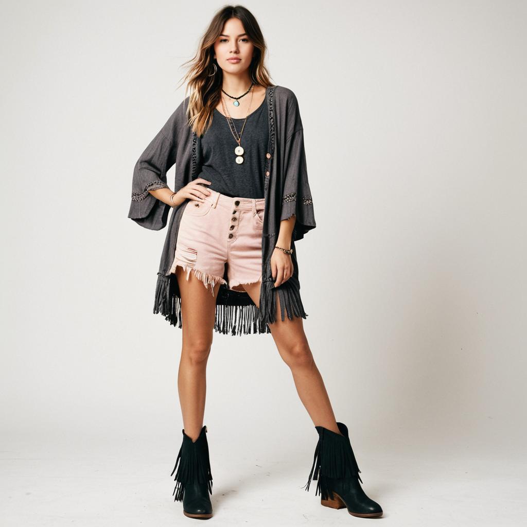 Woman, bohemian casual, oversized charcoal top with three-quarter sleeves, scoop neckline, paired with light beige shorts, frayed hem, high-waisted with button closure, long pink lace cardigan with fringe trim, ankle black leather boots with a slight heel, long pendant necklace, white studio background.