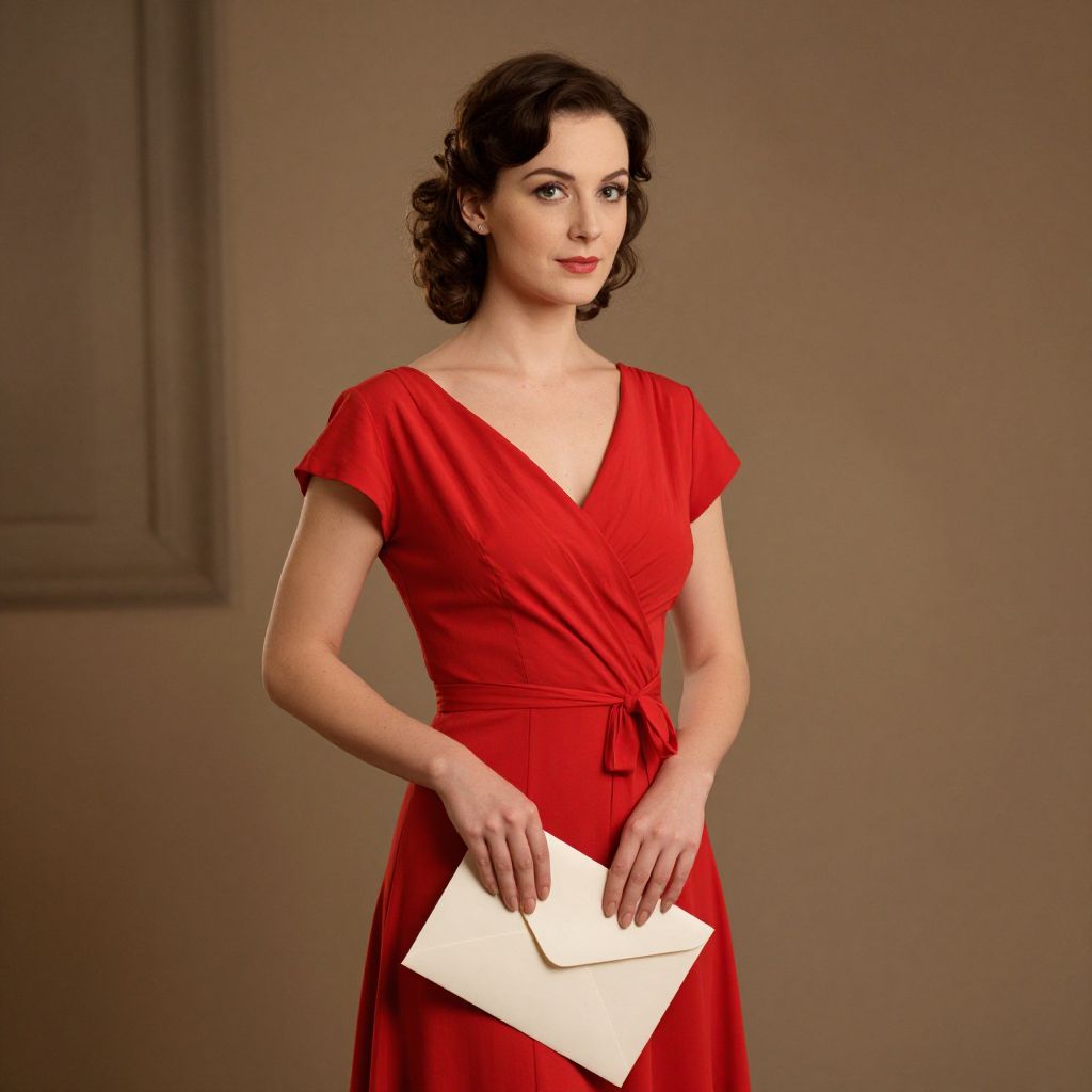 Photograph of an East Asian woman with fair skin and black, wavy hair styled in a vintage updo. She wears a vibrant red, V-neck dress with short sleeves and a belted waist, holding a white envelope in her right hand. Her red lipstick matches her dress, and she has a calm, confident expression. The background is a plain, beige color, highlighting her figure and attire. The image has a soft, studio lighting that enhances the warm tones and textures of her dress and skin.