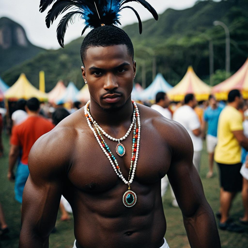 Close-up portrait of a young dark-skinned Arab man wearing a white traditional headscarf with green and gold trim, white shirt, and gold earrings. He has a neatly groomed beard and intense brown eyes looking directly at the camera, set against a softly blurred background.