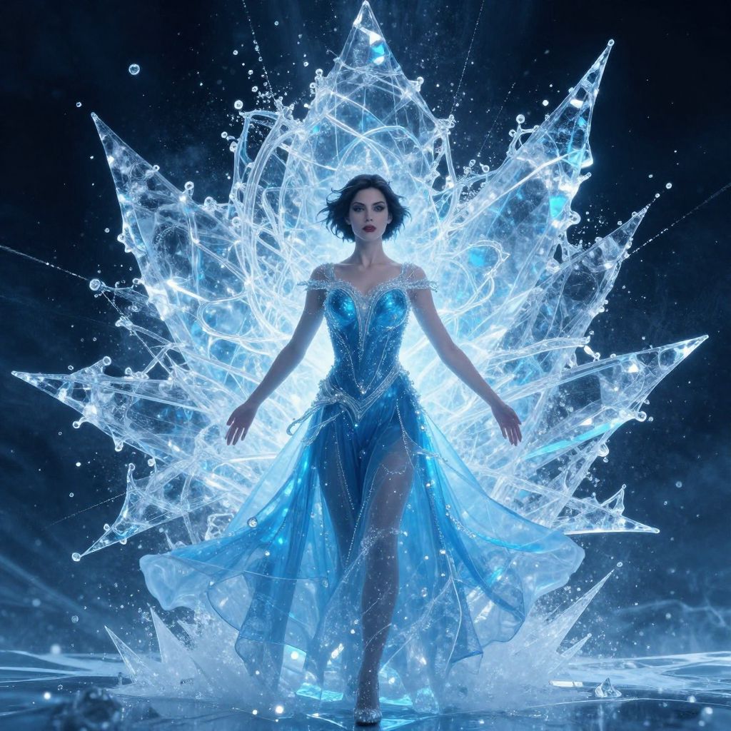A digitally created image of a woman with short black hair, wearing a strapless, shimmering blue gown that flows down to her ankles. She stands in the center, surrounded by an ethereal, glowing, crystalline aura that radiates from her back and spreads outward. The background is dark, emphasizing the bright, luminous blue and white colors of her dress and aura. The crystals have a jagged, ice-like texture, contrasting with the smooth fabric of her gown. Her arms are outstretched, and she has a confident, almost mystical expression on her face. The overall style is futuristic and magical.