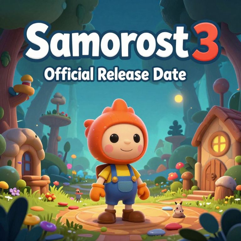Digital artwork in a vibrant, cartoon style featuring a cheerful character with an orange, rounded head, yellow shirt, blue overalls, and brown shoes standing in a whimsical forest. The character has a simple, smiling face with black eyes. The background showcases colorful, fantastical trees, mushrooms, and a small wooden house with a lit yellow window. The sky is a gradient of blue to dark at the top. Text at the top reads "Sanorost3 Official Release Date" in bold white and red letters. The scene is bright and lively, with a glowing path beneath the character.