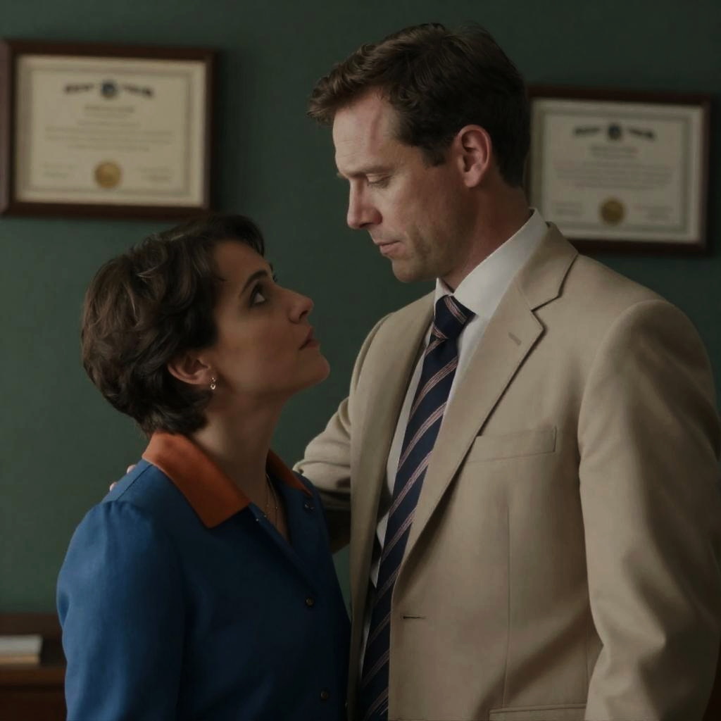 Photograph of two people in a dimly lit office. Blonde woman in brown jacket and black pants stands beside a desk, facing an older man in a gray suit sitting on the edge. Office has green carpet, black filing cabinets, fluorescent lights, and a window with blinds. Both people look at each other with neutral expressions.