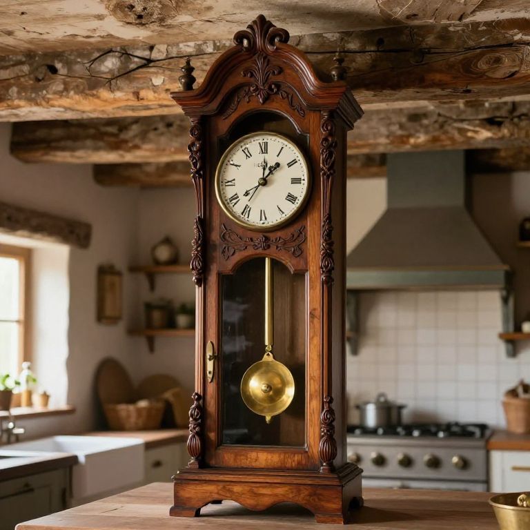 Comtoise clock standing prominently in a rustic French farmhouse kitchen, warm natural lighting highlighting its intricate brass pendulum and ornate wood carvings, aged wooden beams in the background, cozy and vintage atmosphere, high detail.