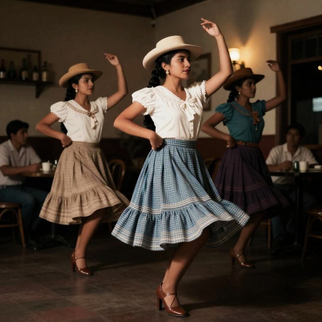 Photograph of three Latina women dancing in a dimly lit, rustic room. They wear white short-sleeve blouses, checkered skirts in blue and beige, and brown straw hats. The woman in the foreground, with dark hair and medium brown skin, strikes a dynamic pose with her right arm raised, wearing brown heels. The two women in the background mirror her movements. The room has wooden furniture, framed pictures, and soft yellow lighting, creating a warm, nostalgic ambiance. The tiled floor adds texture to the scene.