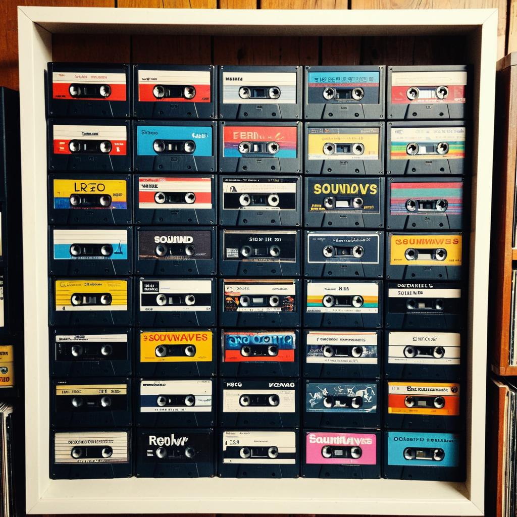 Focus Shot On The Style Inspired Clothing, a shelf containing old cassette tapes in their respective cases, all labeled with real 1970s band names; in the style of a music festival banner, with the title of the movie being Echo Soundwaves, in colorful letters.