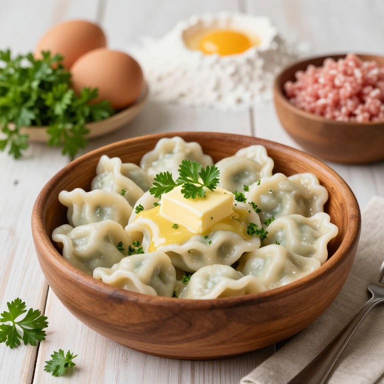 Pelmeni dumplings served in a traditional Russian wooden bowl, topped with melted butter and sprinkled with fresh parsley, surrounded by fresh ingredients like eggs, flour, and minced meat on a wooden kitchen table, soft natural daylight, cozy and inviting scene