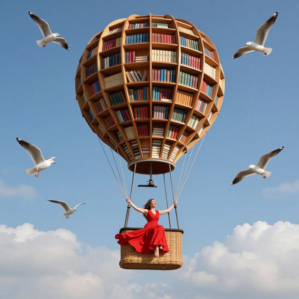A whimsical hot air balloon, crafted entirely from wooden bookshelves filled with colorful books, soars gracefully through a vibrant sky, surrounded by seven seagulls, while a woman in a flowing red dress joyfully hangs below, her arms outstretched amidst fluffy white clouds.