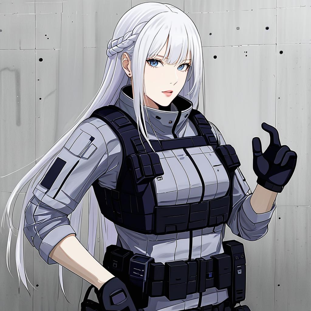 Anime-style illustration of a young woman with long white hair and a braided section, wearing tactical clothes and black gloves. The character has striking blue eyes and a confident expression, dressed in a grey tactical suit with black armor plating, standing against a grey concrete wall background.