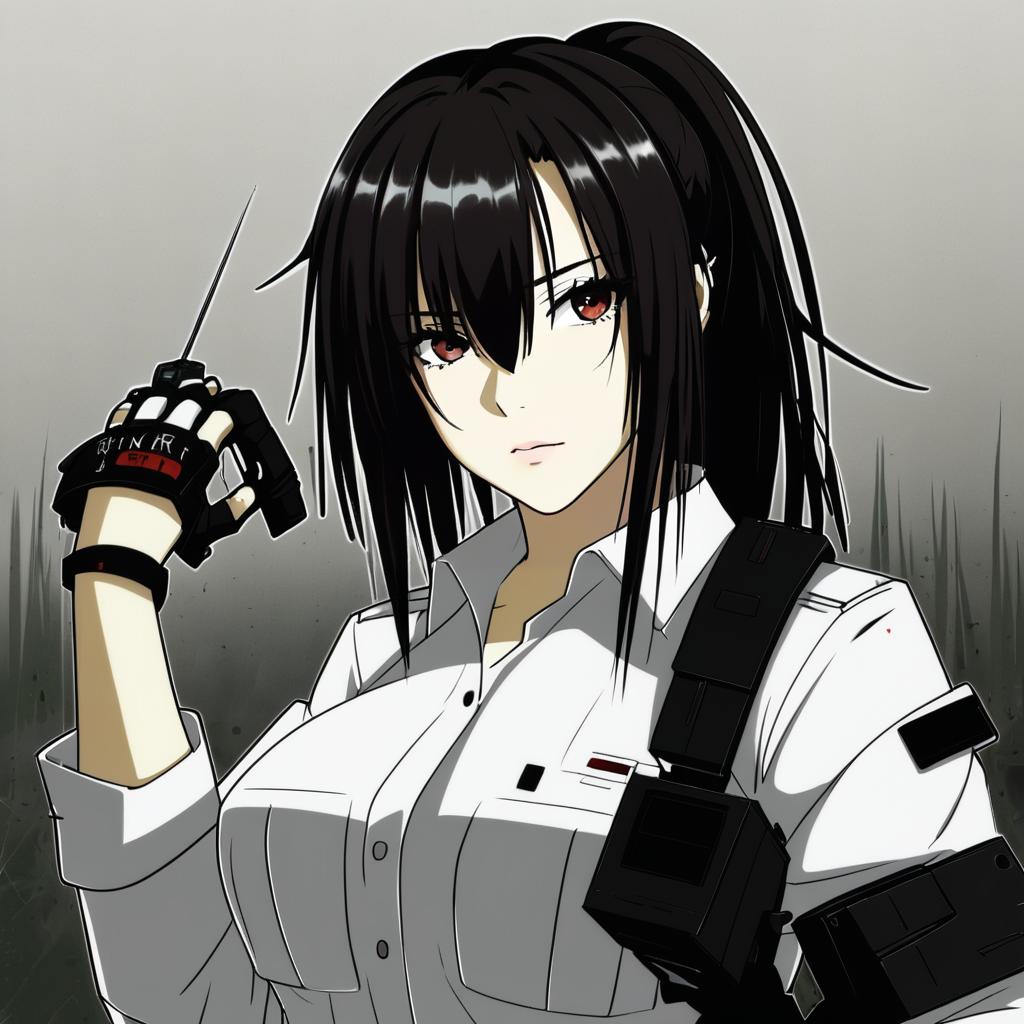 Digital anime-style illustration of a determined young woman with black hair in a ponytail, brown eyes, and a scar on her face. She is wearing a white long-sleeve shirt with black tactical gear and a single mechanical arm. The background is muted gray with abstract dark markings.