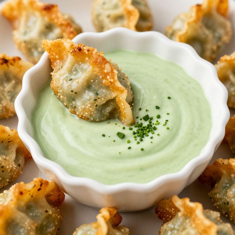 A close-up photo of a white ceramic ruffled bowl filled with smooth, light green dipping sauce, topped with tiny green herb sprinkles. A golden-brown, crispy-fried dumpling with herb seasoning is partially submerged in the sauce, while more dumplings surround the bowl. The bright lighting highlights the textures and colors, making the dish look appetizing and fresh.