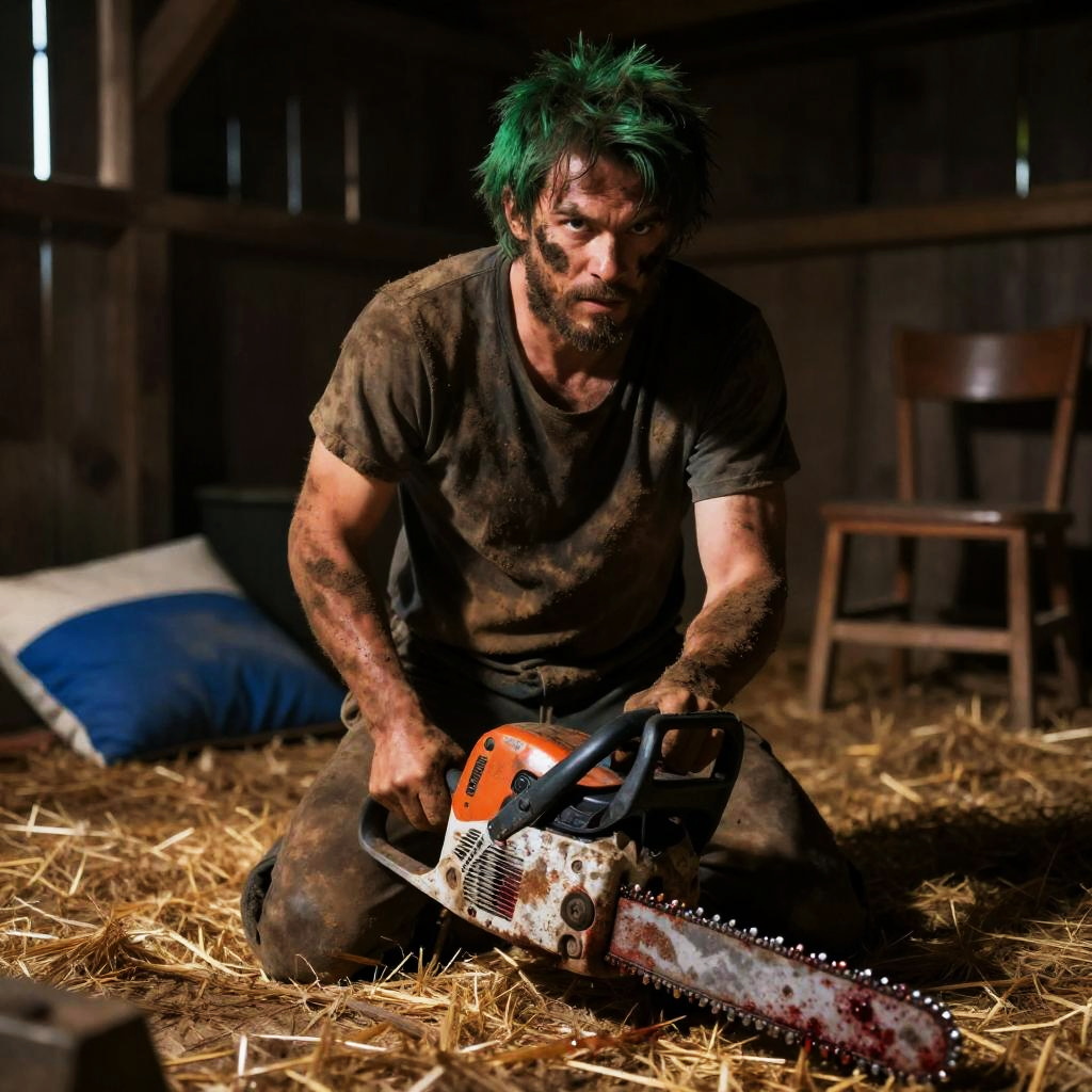 Grizzled, green-haired man with mud-covered face and body, holding a rusty chainsaw, kneeling on straw, intense expression, in a dimly lit barn with hay, a blue and white pillow, and a wooden chair in the background. Blood on chainsaw and straw.