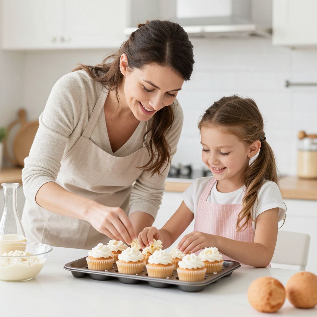 Photograph of a smiling mother with brown hair and a young daughter, both wearing casual clothes, decorating cupcakes in a bright, modern kitchen.