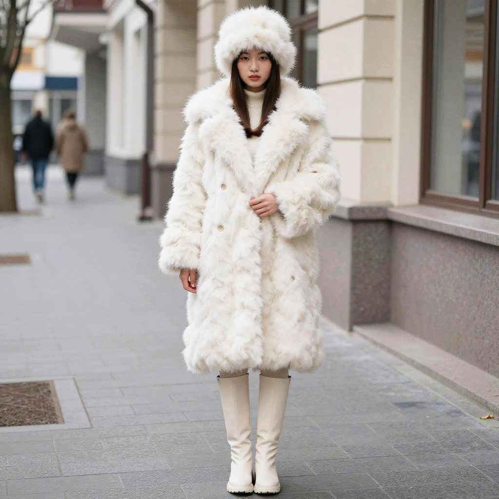 Young woman wearing a fluffy white fur coat, matching fur hat, white boots, and a cream turtleneck sweater standing on a city sidewalk with blurred buildings and pedestrians in the background. The outfit is stylish and suitable for cold weather.