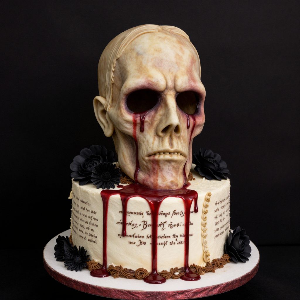 Severed head wedding cake, stylized horror cake featuring a medieval style severed head with vivid texture and dripping blood effects, surrounded by gothic calligraphy and dark floral arrangements, blending unsettling horror imagery with elegant cake artistry