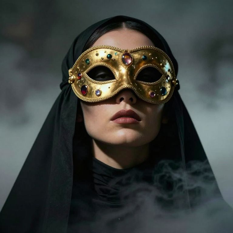 Photograph of a woman with pale skin, wearing a black veil that covers her hair and neck. She has a gold masquerade mask adorned with colorful gems (red, green, blue) on her face, which reveals only her lips and chin. The background is a moody, cloudy blue-gray, adding a sense of mystery. Her expression is neutral, and the mask's intricate design contrasts with the simplicity of her veil. The image focuses on her face, with soft lighting highlighting the mask's texture and the veil's smooth fabric.