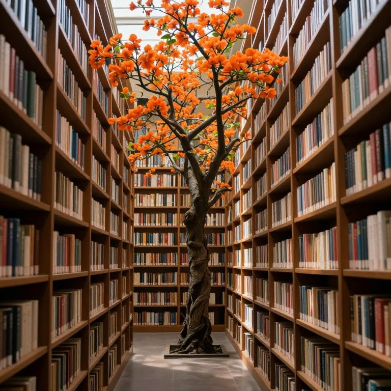 A serene library aisle transforms into a surreal fusion of nature and knowledge, where a blossoming tree with vibrant orange flowers emerges amidst endless rows of bookshelves, casting a dreamlike glow over the scene.