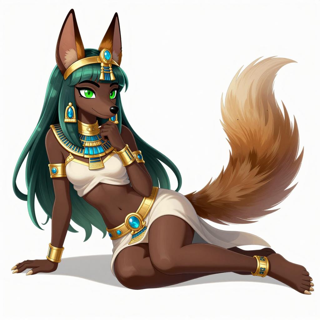 Digital artwork of an Anubis-inspired monster girl character with dark skin, green long hair, and green eyes. She has wolf and jackal ears, a large bushy tail, and animal-like clawed hands. The character is dressed in white and gold Egyptian-themed accessories, lying on a soft surface in a playful pose. The illustration is influenced by the Monster Girl Encyclopedia style and created by artist Morii Shizuki.