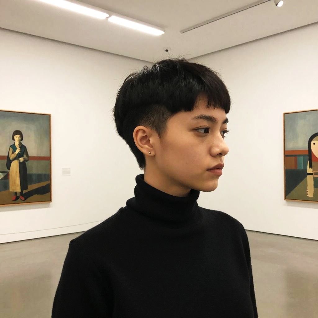Nape Undercut hairstyle on young woman, wearing sleek black turtleneck, in contemporary art museum, captured in fashion editorial style with cool fluorescent gallery light.