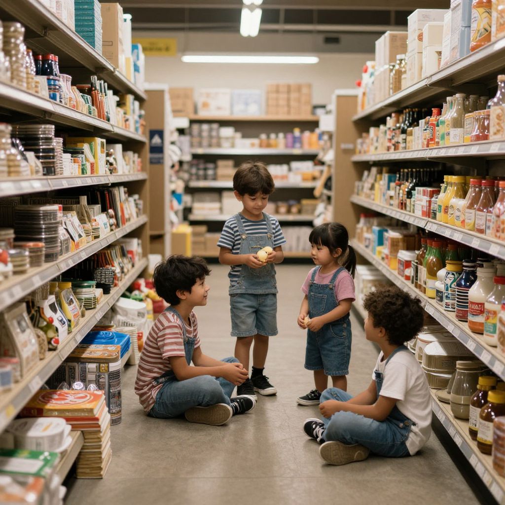 Photograph of four young children, three boys and one girl, in a brightly lit grocery store aisle. The aisle is lined with shelves filled with various packaged foods. The children, with diverse hair colors and styles, are dressed in casual clothing: striped shirts, denim overalls, and jeans. They are seated and standing, engaging in conversation while examining items on the shelves. The background features more shelves and fluorescent lighting. The floor is concrete, and the shelves are filled with colorful packaging, creating a vibrant, busy atmosphere.