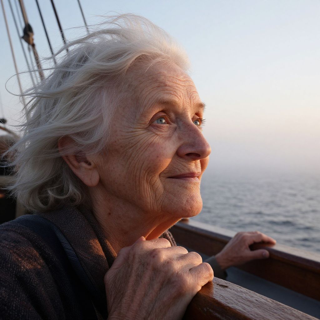 Create an image of a close-up portrait of an elderly woman with a joyful expression, her eyes a wistful blue, reflecting a lifetime of adventures on the sea. Her face, marked with lines of experience, hints at untold stories, and is framed by wild, white hair, windswept and tangled like seaweed. She grips the rough-hewn railing of an ancient wooden ship, her hand weathered and strong. The setting sun casts a warm glow on her as she gazes into the distance, a horizon shrouded in fog, creating long shadows across her visage. This scene evokes a sense of awe and a touch of melancholy, capturing the essence of a life fully lived on the open ocean and the relentless march of time. The hyperrealistic portrayal showcases intricate details of her skin, from age spots to faint scars, testaments to her years of navigating challenging waters, all rendered with stunning realism. The backdrop, a foggy horizon, speaks to the transient nature of life, emphasizing the constant flux and flow we experience throughout our journeys. It captures the beauty and poignancy of a life intertwined with the sea.
